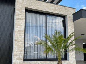 Para uma estética mais contemporânea e industrial, o contraste do Travertino com serralheria em metal escuro e grandes painéis de vidro resulta em um visual industrial e elegante.