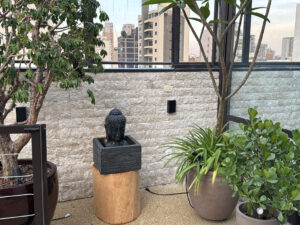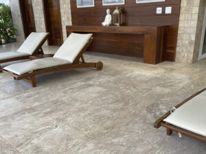 Áreas Externas: em varandas gourmet e decks de piscina, o Travertino é uma escolha funcional e esteticamente agradável. Sua capacidade de não absorver calor excessivo o torna confortável ao toque, mesmo sob o sol, criando uma transição fluida entre o ambiente construído e a paisagem.