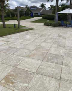 - Continuidade Visual (Interno e Externo): Um dos recursos mais luxuosos da arquitetura contemporânea é o uso do mesmo revestimento no piso interno e externo. Isso cria uma sensação de amplitude infinita, “apagando” a transição entre a casa e o jardim. Com o auxílio do hidrofugante, pedras como o Basalto ou o Travertino podem cumprir esse papel com excelência.